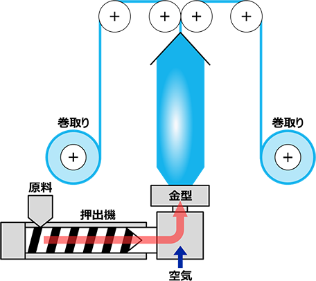 インフレーション方式とは、空気の量と樹脂の押出量で製品の幅、厚みを調整する生産方法です。